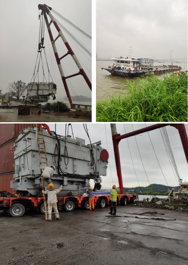 面对客户急切的主变压器转运需求,货运物流事业部大件项目部迅速组织起重技师耐心分析各种运输线路的可行性。由于沿途桥梁隧道限高,而该厂刚好临近码头,大件项目部的技师们决定采用水陆联运的方式绕开限高路段。在起点将主变压器推出基础后,使用300吨浮吊将其吊装至平板船内,稳妥放置后开往鱼珠码头进行接驳装车,再通过陆路运往客户指定的地方进行卸车,最大限度地完成了转运任务,为客户省去不必要的行车成本。